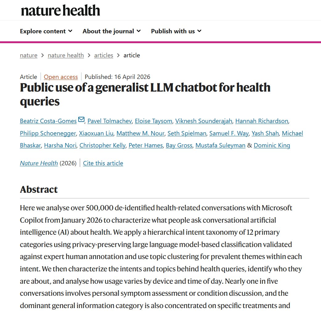 Tweet: Our paper landed in Nature Health today! Healthcare is one of the most high-stakes, high-potential applications of AI. So we set out to understand how people actually use it in our AI products today. https://www.nature.com/articles/s44360-026-00117-x @mustafasuleyman: "Our paper landed in Nature Health today! Healthcare is one of the most high-stakes, high-potential applications of AI. So we set out to understand how people actually use it in our AI products today. https://www.nature.com/articles/s44360-026-00117-x https://x.com/mustafasuleyman/status/2044817893460996487/photo/1" A screenshot from the Nature Health journal website displays the article titled "Public use of a generalist LLM chatbot for health queries" with Open access tag, published 16 April 2026, authors including Beatriz Costa-Gomes, Pavel Tolmachev, Eloise Taysom, Mustafa Suleyman, and Dominic King, plus the start of the abstract analyzing over 500,000 de-identified health-related conversations with Microsoft Copilot from January 2026. Visible UI elements include the nature health logo and magenta navigation bar with Explore content, About the journal, and Publish with us dropdowns, the nature > nature health > articles > article breadcrumb, Cite this article link, and hierarchical intent taxonomy reference in the abstract text. Researchers analyzed over 500,000 de-identified health-related conversations with Microsoft Copilot from January 2026, revealing that nearly one in five involve personal symptom assessment or condition discussion, one in seven concern others as a caregiving tool, queries peak in evening/nighttime hours when healthcare is limited, mobile devices focus on personal health while desktops emphasize professional/academic work, and many address navigating healthcare systems. These patterns, identified via hierarchical intent taxonomy and topic clustering, hold direct implications for platform-specific design, safety considerations, and responsible development of health AI like Microsoft Copilot, ChatGPT, and Gemini amid their growing role in medical journeys.