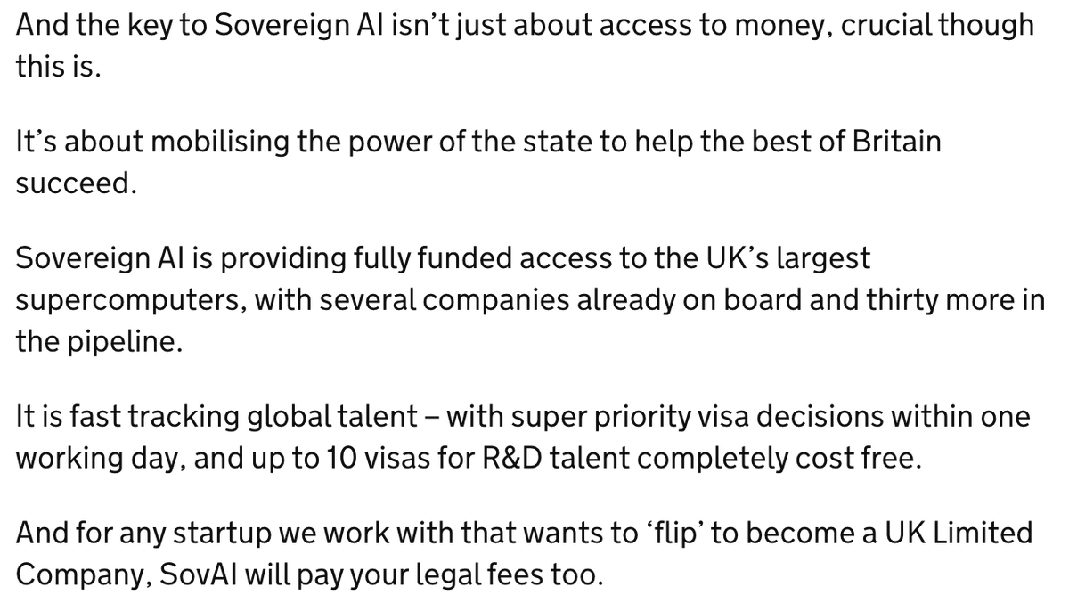 A screenshot on a plain white background contains five left-aligned paragraphs of black serif text from a Sovereign AI policy announcement. Visible excerpts include "Sovereign AI is providing fully funded access to the UK’s largest supercomputers, with several companies already on board and thirty more in the pipeline," "super priority visa decisions within one working day, and up to 10 visas for R&D talent completely cost free," and "for any startup we work with that wants to ‘flip’ to become a UK Limited Company, SovAI will pay your legal fees too."